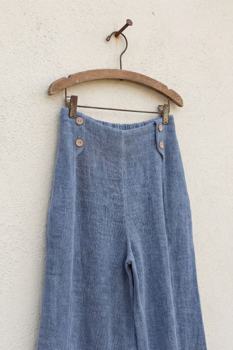 Effortless and beautifully fluid, these wide-leg pants are crafted in Italy from a lightweight linen–cotton blend that feels breathable and soft against the skin. Designed with a mid-rise waist and finished with decorative front buttons, they offer a relaxed silhouette with a graceful, natural drape.