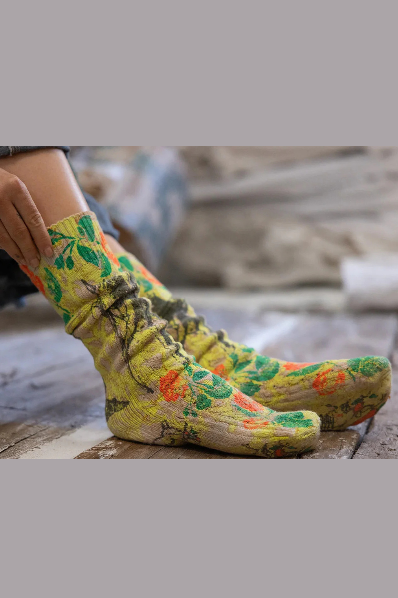 These soulful Magnolia Pearl socks are a wearable work of art....infused with poetry, nostalgia, and that unmistakable lived-in beauty. Crafted from soft cotton knit, they feature neon marigold roses intertwined with printed cherubs, then lovingly hand-faded, distressed, and mended for a perfectly imperfect finish. Designed to be seen and felt, they bring a touch of magic whether peeking out from boots or layered with sandals and skirts.