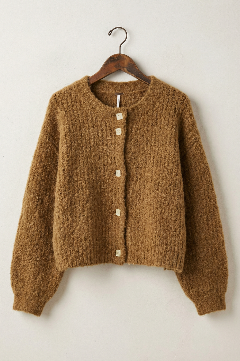 Cozy, textured, and effortlessly charming, this soft knit cardigan is the perfect throw-on layer for cooler days. Made from a plush blend of polyester, acrylic, and wool, it features a warm, nubby finish and the sweetest square buttons down the front. The relaxed fit and dropped shoulders add to its laid-back feel, making it easy to pair with everything from dresses to denim.