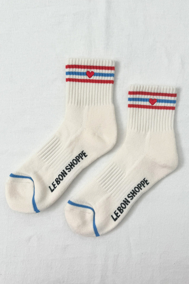 Say hello to the cutest crew socks to exist. Similar to the Boyfriend Socks, except with a short leg that fits true to the classic crew length. Under the classic triple contrast stripe sits an embroidered heart, adding the sweetest touch of affection to any outfit.