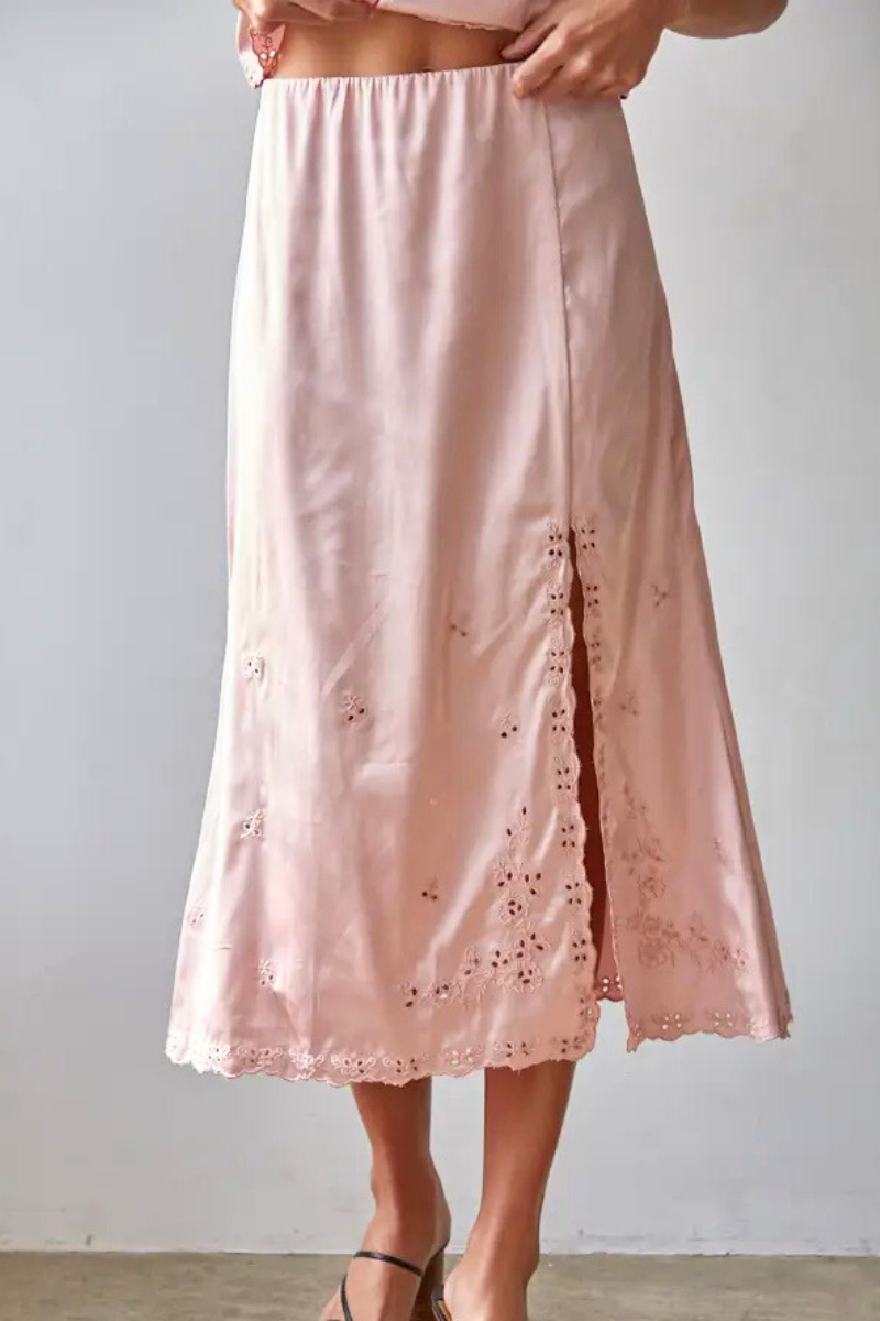 Softly romantic with a hint of edge, this embroidered satin midi skirt brings an easy elegance to everyday dressing. Cut in a fluid woven satin with delicate embroidery throughout, it features a subtle side slit for movement and a flattering, feminine drape. Finished with a side zipper and an elastic waist for comfort, it’s beautiful worn on its own or styled as an optional set.