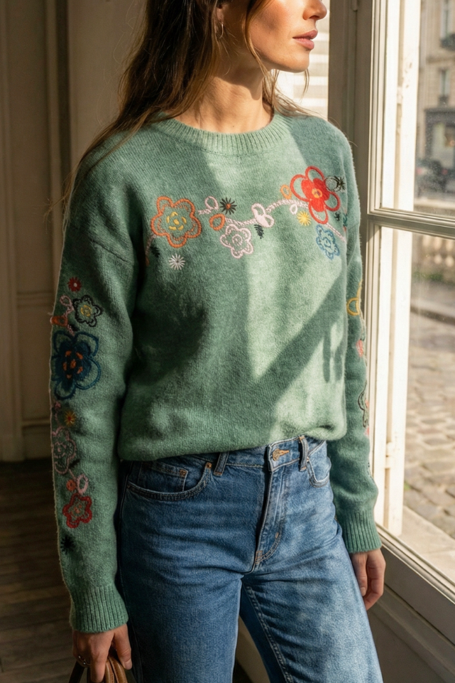Cozy with a touch of charm, this embroidered pullover sweater brings a playful dose of color to cooler days. Designed with a relaxed silhouette, it features drop-shoulder long sleeves, a ribbed crew neckline, and beautifully stitched floral embroidery across the front and sleeves. Soft, warm, and easy to style—perfect with denim for an effortless everyday look.