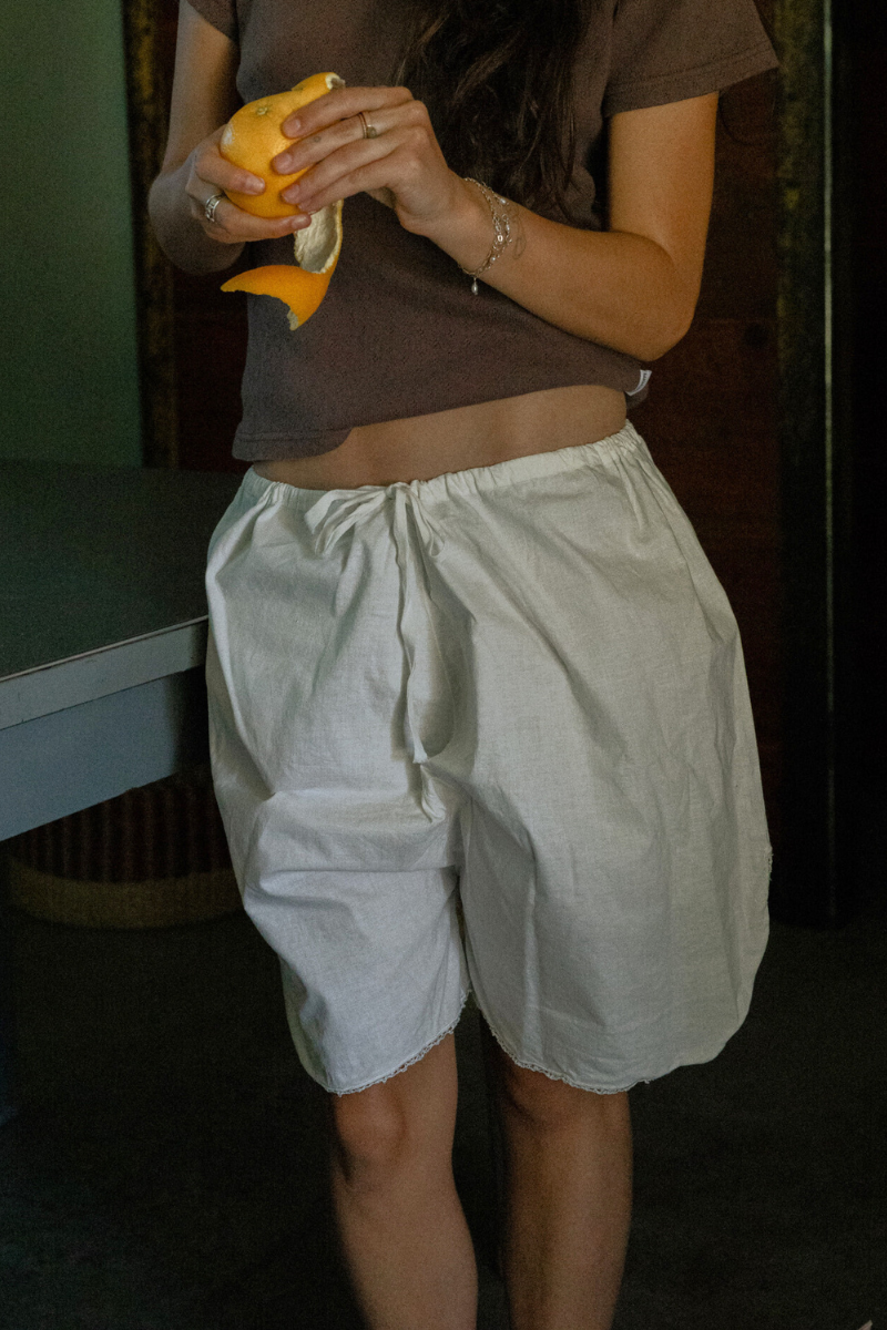 Today, they’re perfect styled as breezy summer shorts, layered under dresses, or cherished as heirloom textiles.