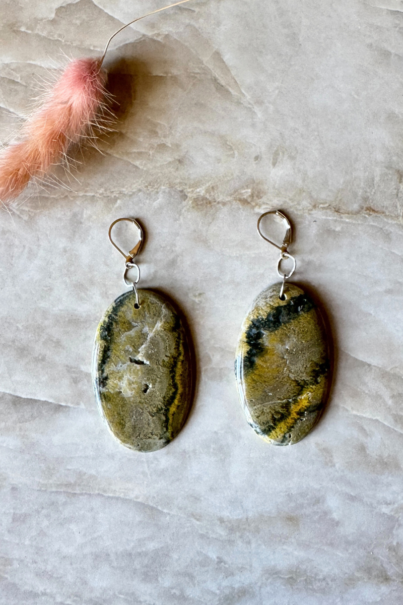 These one-of-a-kind stones showcase a mix of soft mossy greens, rich ochre, and subtle sparks of yellow, all in beautiful 2.25" oval shapes. Wrapped in sterling silver wire and finished with sterling leverbacks, they’re the perfect blend of statement and natural elegance.
