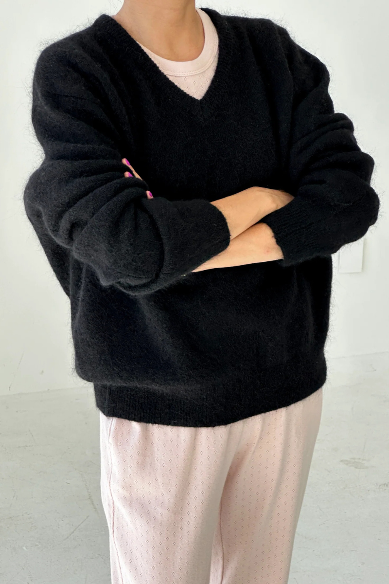 Cozy layering made simple in the James Mohair Sweater. Unlike your everyday V-neck, this sweater is made from an ultra cozy, mohair wool blend to keep you warm throughout the seasons. It features a timeless silhouette that’s slightly oversized and maintains a boxy fit for easy layering without any itchiness in sight. The perfect piece to elevate any look without compromising comfort.