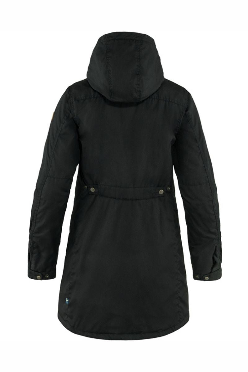 Long, lightly padded everyday parka with fixed, adjustable hood. Made from durable G-1000 Original that resists wind and rain, with a recycled polyamide lining. The synthetic padding G-Loft Supreme gives extra warmth, even in damp conditions. Perfect as an everyday jacket during the colder months of the year, and the hardwearing outer fabric makes it suitable for forest walks as well. The model is long for warmth over the rear and thighs and the front zipper is two-way, with a protective flap on both the inside and outside to stop cold winds. There is a chest pocket and two hand pockets, all with zippers. The waist can be adjusted with buttons at the back. Adjustments with press buttons at sleeve cuffs. The jacket can be impregnated with Greenland Wax for added protection against wind and rain.