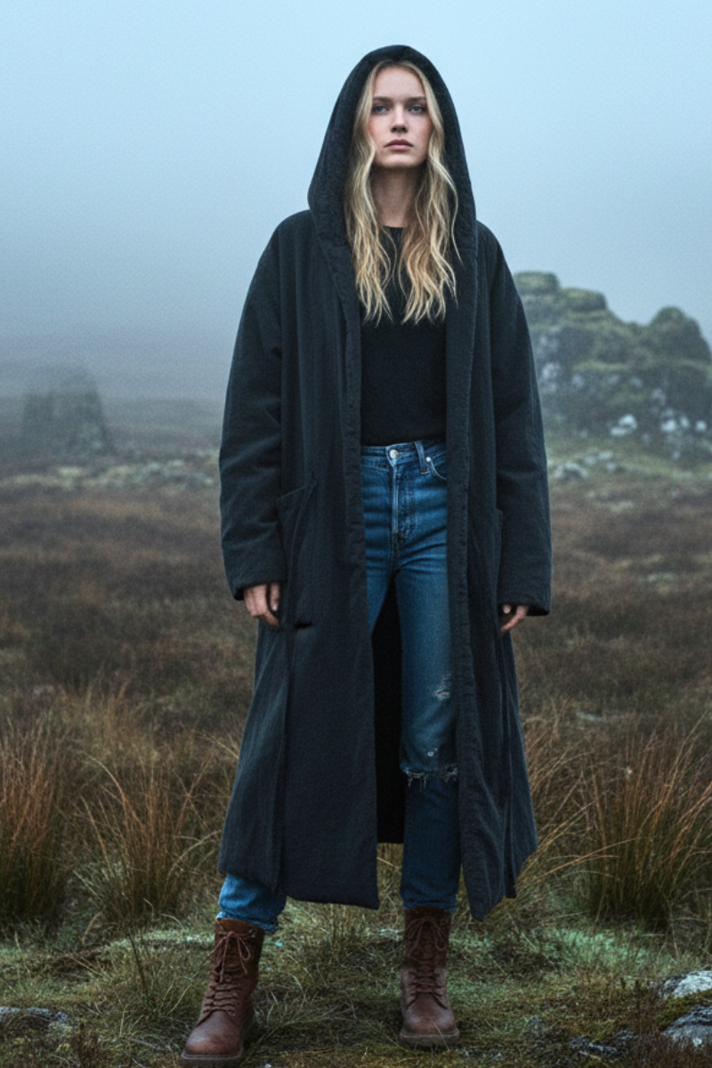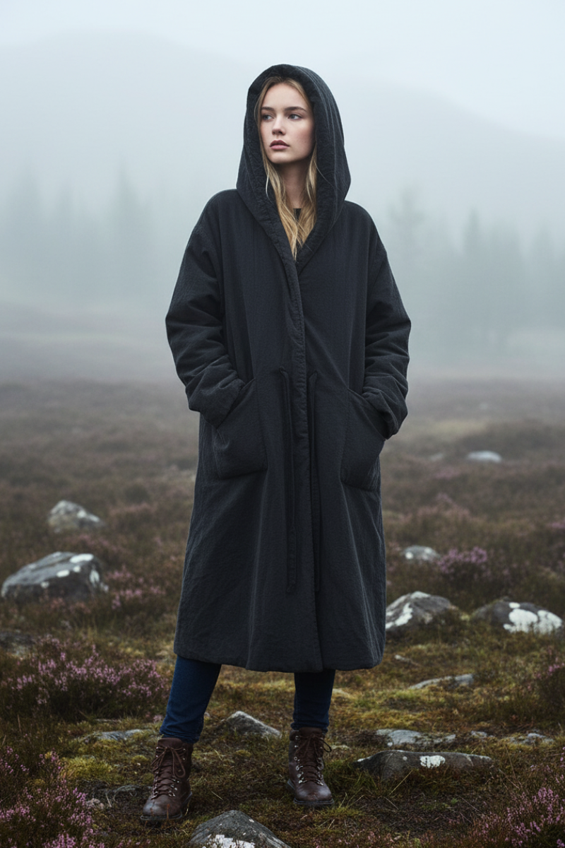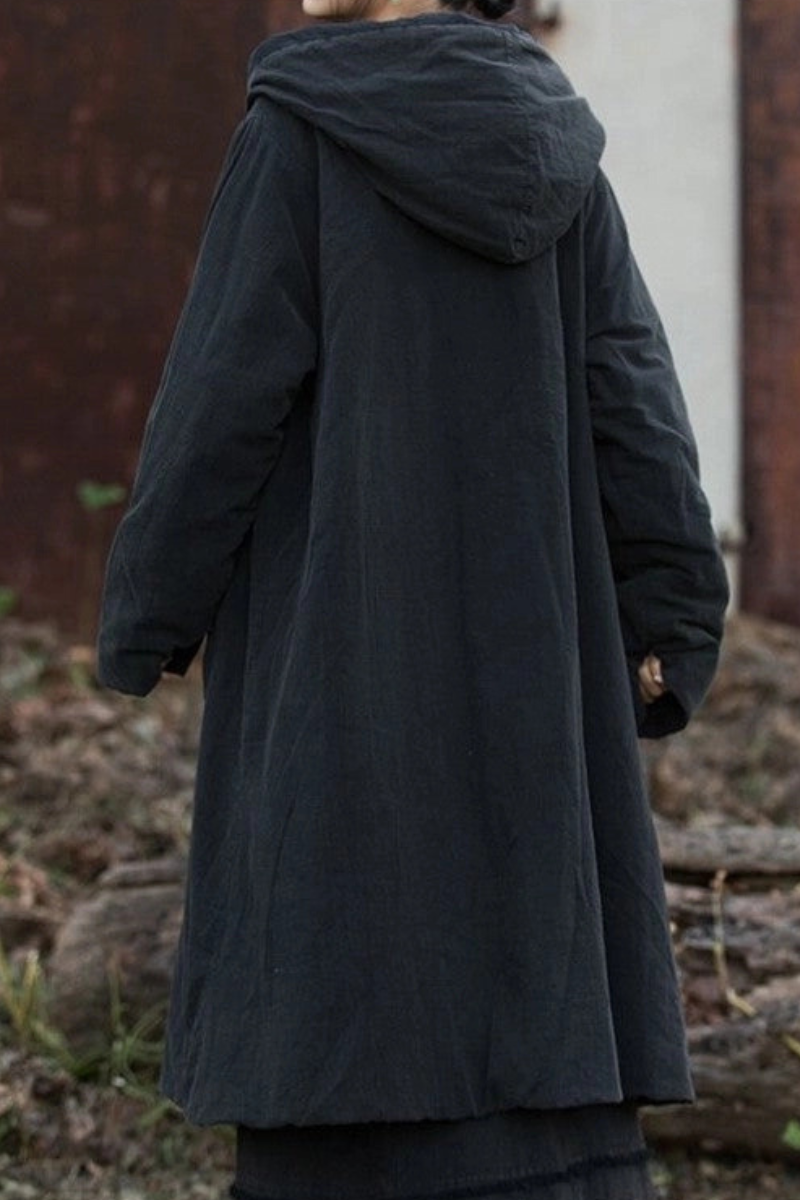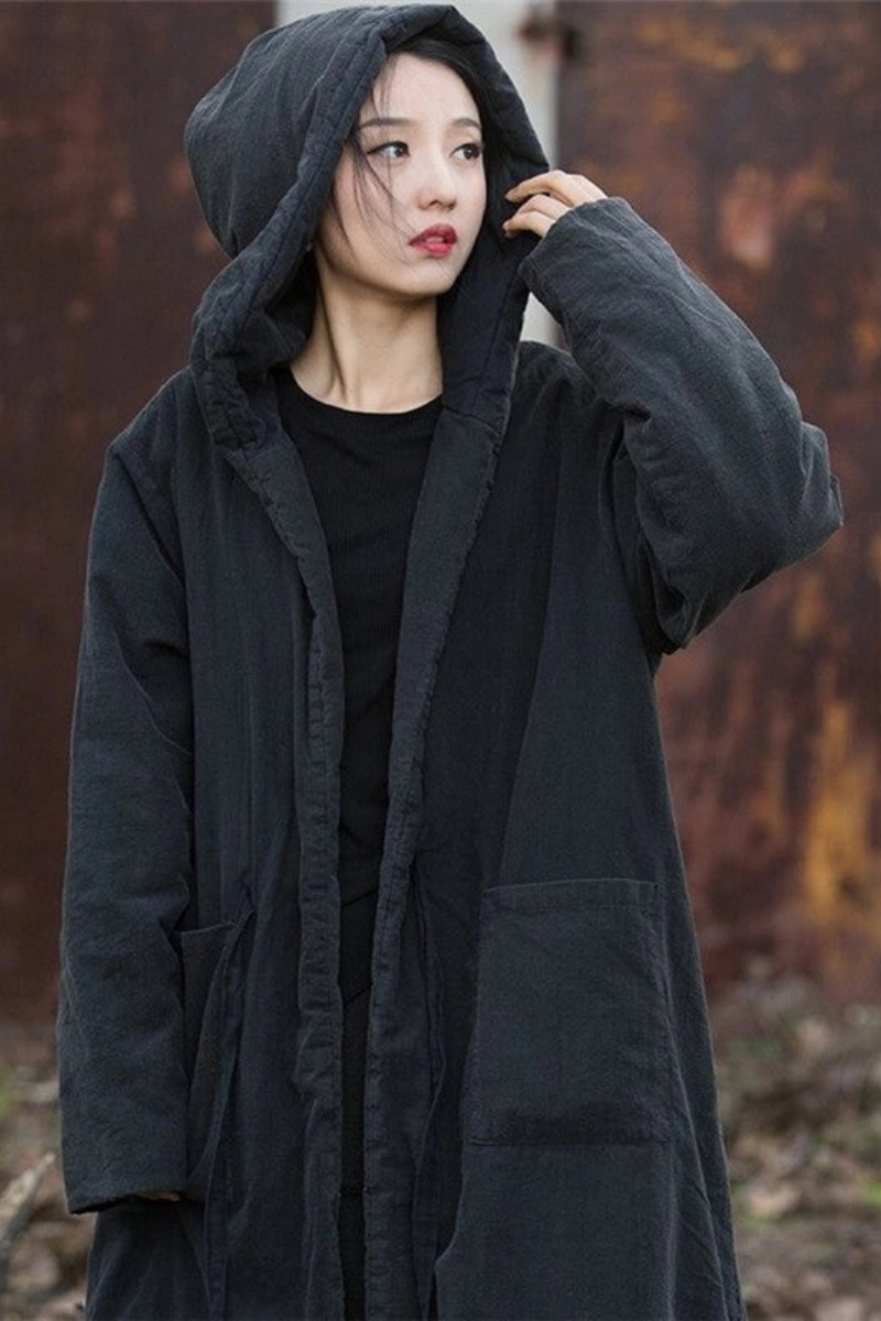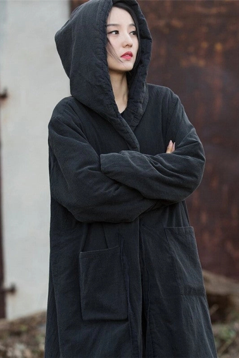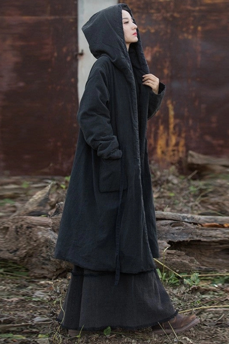 A cloak of quiet strength, this long hooded cotton-hemp coat carries both mystery and comfort. With its padded weight and lived-in texture, it drapes effortlessly, wrapping you in warmth and soulful style. Perfect for layering on crisp mornings, artistic wanderings, or cozy evenings by the fire—this piece feels timeless, like something passed down through generations.
