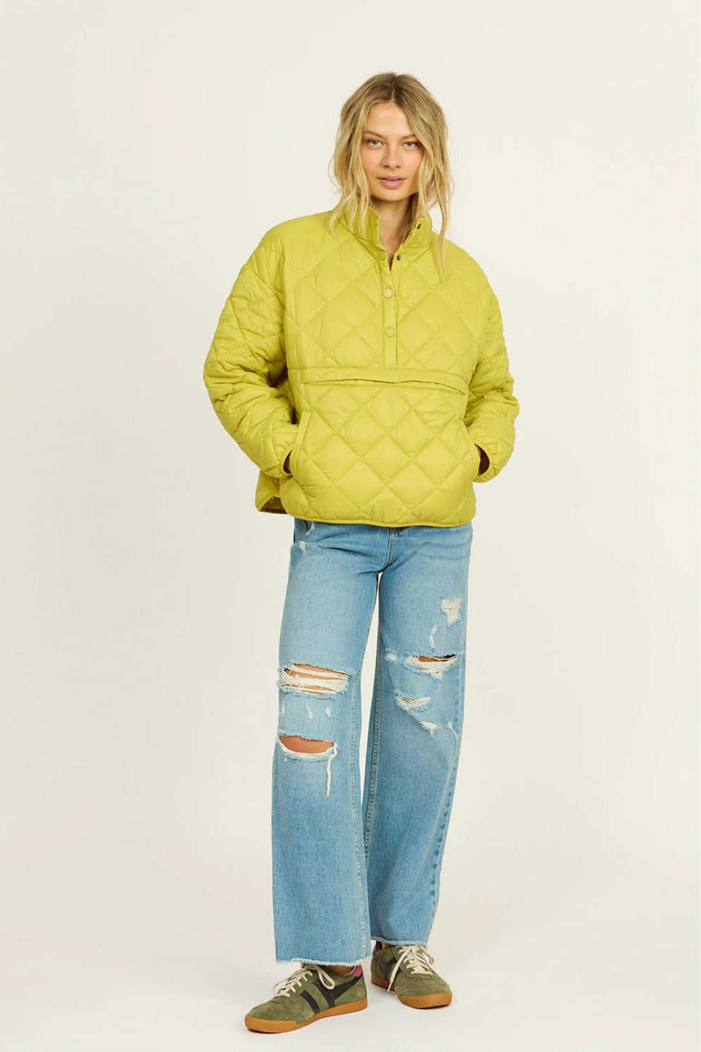 Brighten up chilly days with this citrine puffy jacket, crafted from recycled nylon for a sustainable touch. Quilted stitching, welt pockets, and matte snaps blend function with style, making it a fun layer for unpredictable weather.