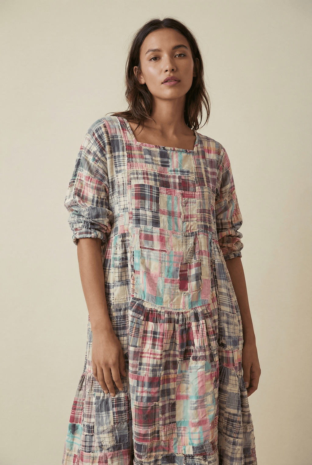 Experience luxury with our Patchwork Helenia Dress, featuring hand fading and distressing, hand mending, and raw edges in the stunning MADRAS BLUE fabric.