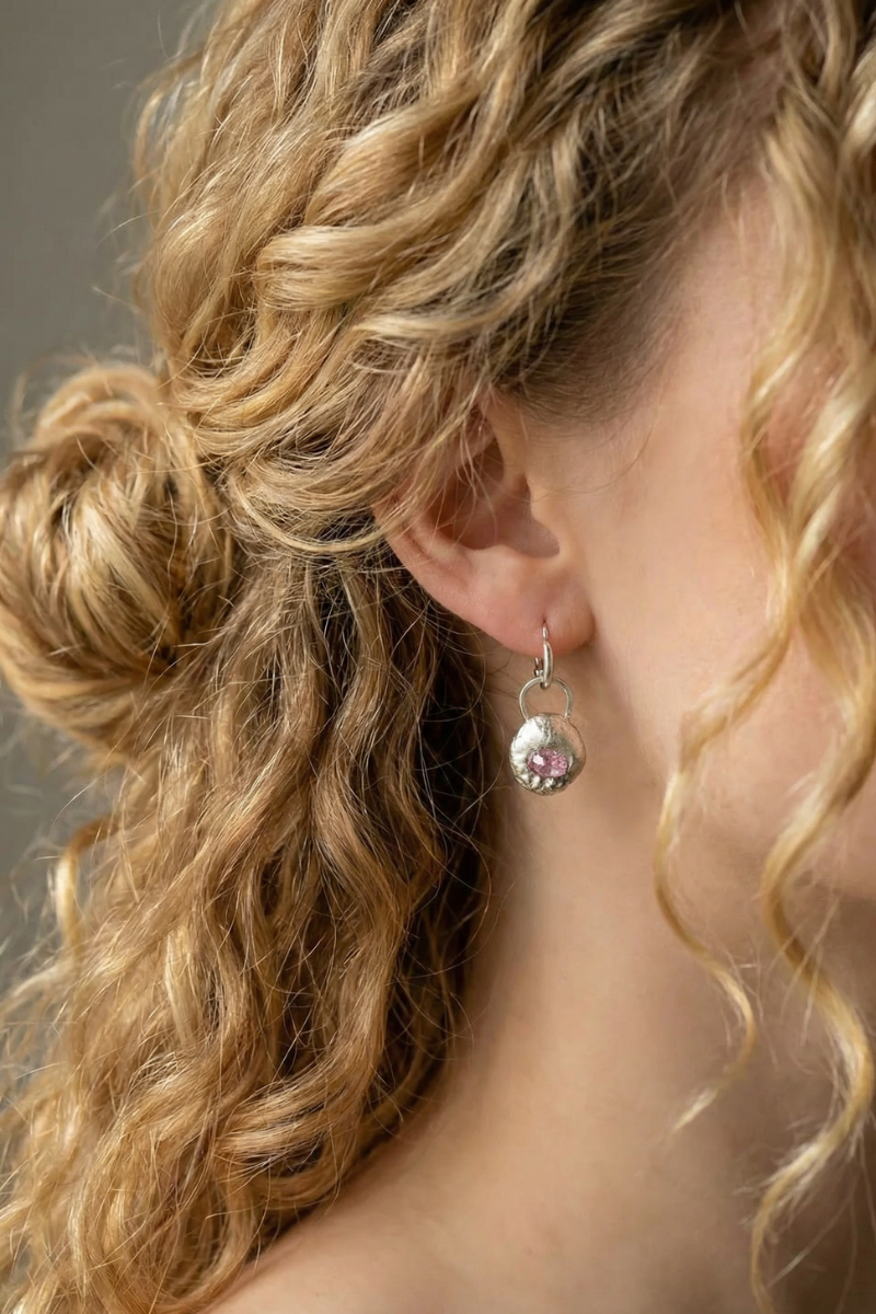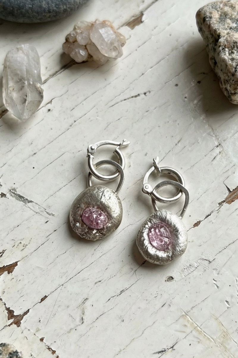 Hand-formed from molten sterling silver, these petite earrings hold a soft, organic shape that feels both modern and timeless. Each piece features a flush-set pink sapphire—subtle sparkle nestled into textured silver—creating a beautiful balance of raw and refined. Hung from sterling silver hoops for easy, everyday wear.