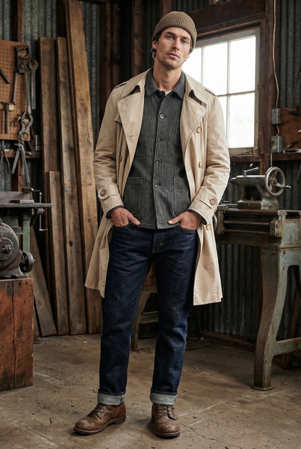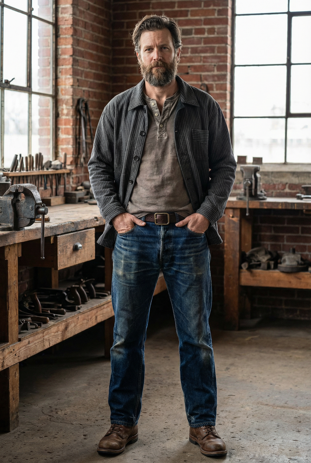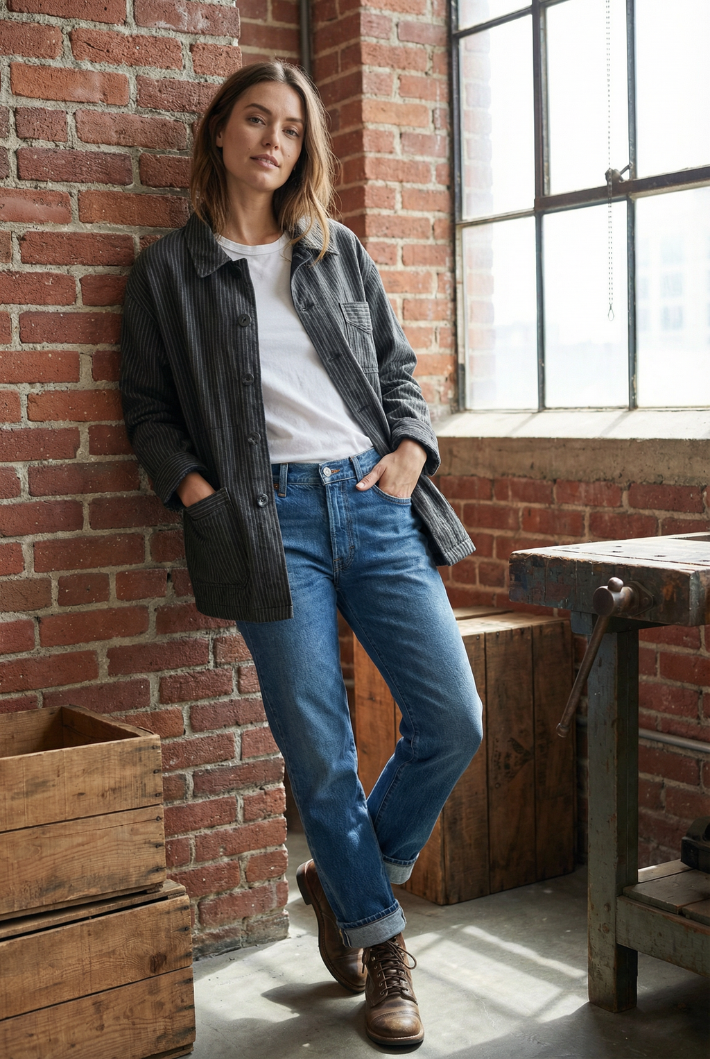 A beautiful and uncommon variation of the classic bleu de travail, this vintage French work jacket features a subtle stripe and textured weave.....a detail rarely found in traditional mid-century workwear. Hand-picked in Paris, it dates from the 1940s–1950s and was originally worn by craftsmen and factory workers who valued durability with understated style.