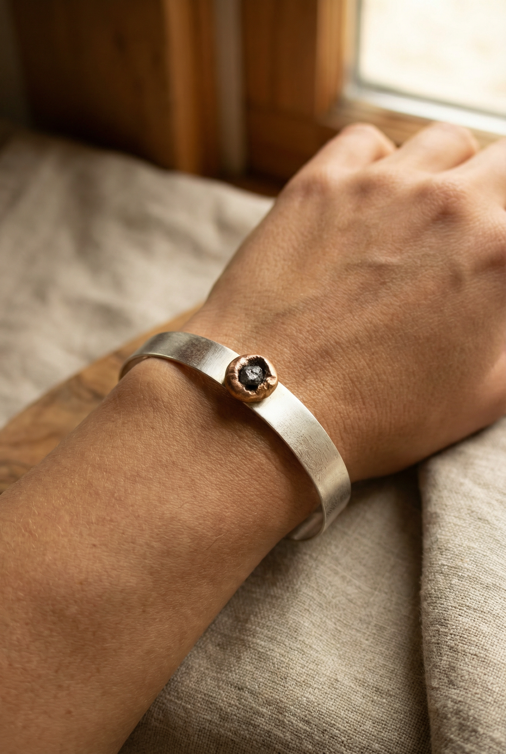 Organic, understated, and quietly powerful...this handmade cuff is a beautiful study in contrast and texture. A 1.5-carat raw diamond sits at the center, its natural, uncut form preserved and celebrated. The stone is framed in a molten 14k gold-filled bezel, bringing warm, luminous tones against the cool strength of a hand-forged sterling silver cuff. Every hammer mark and curve reflects the artistry of true handmade work.