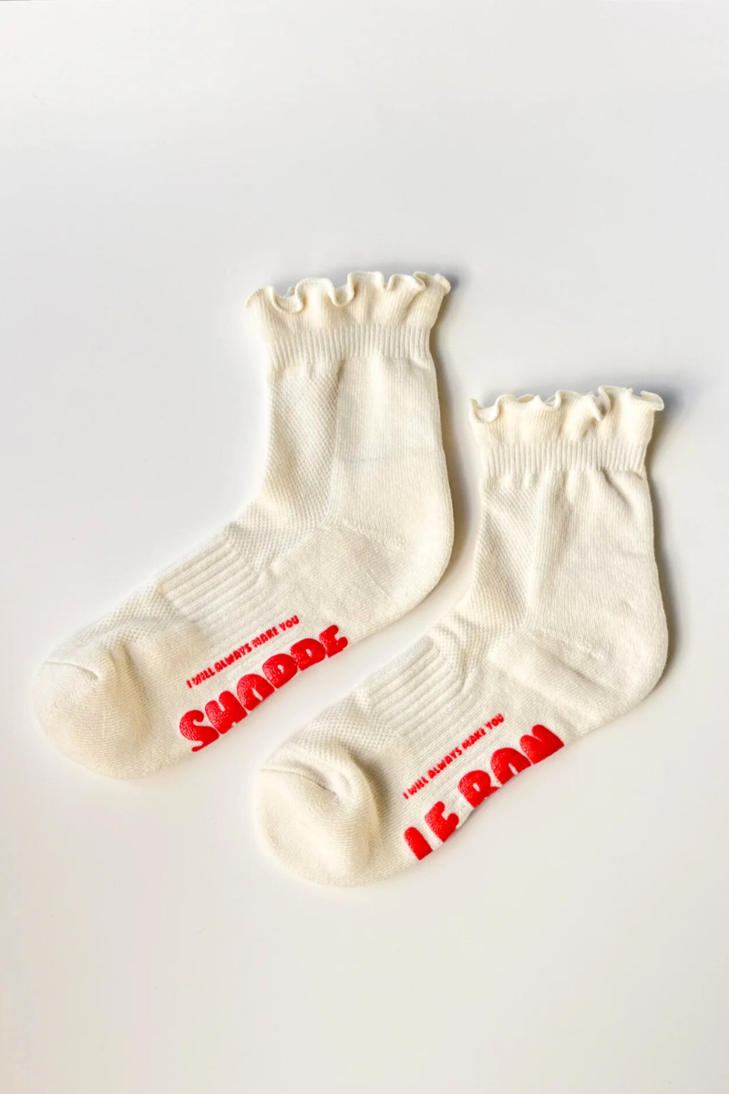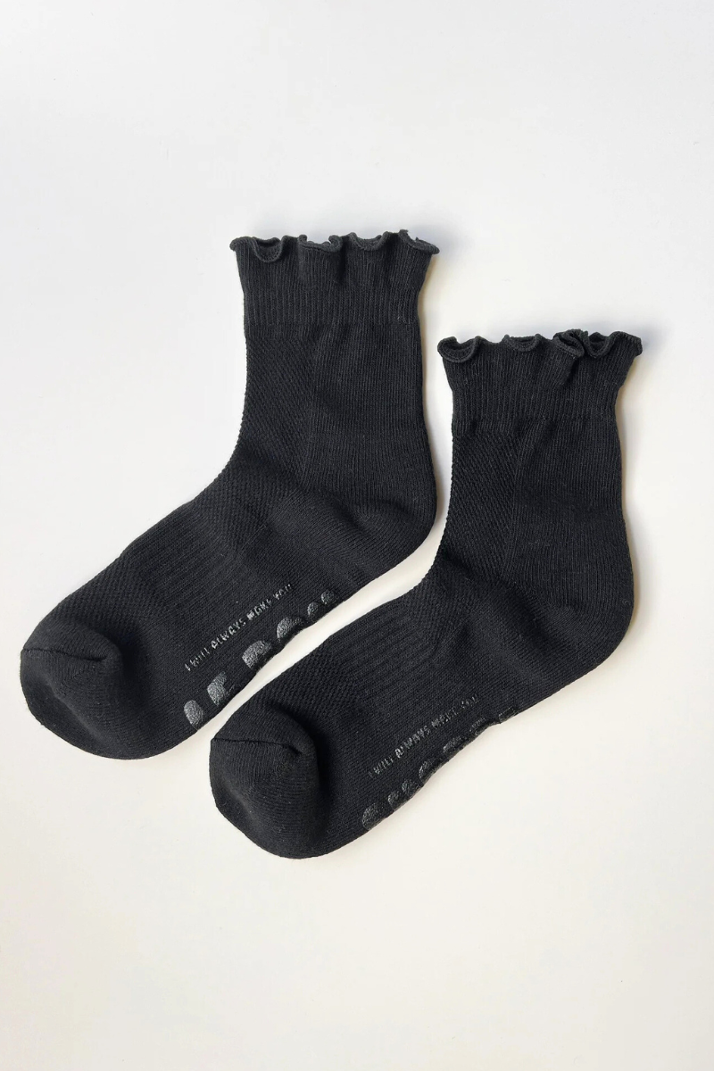 A fun, flirty twist on the classic Hugger, this ruffled crew sock is designed to stay put while adding a soft, playful finish to your look. Featuring a light silicone grip along the sole for secure wear, it’s perfect with flats, clogs, or slides. The delicate ruffled ankle brings just the right amount of charm—easy, comfy, and a little bit sweet.