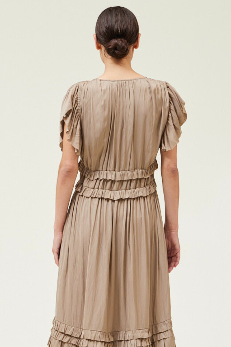 A modern take on romantic elegance, this ruffled midi dress features soft pleating, flutter sleeves, and tiered trim details for effortless movement and charm. Side pockets add a touch of practicality to the flowing silhouette, while the v-neckline and relaxed fit keep things effortlessly chic. Perfect for weekend brunches, casual weddings, or an elevated everyday look.