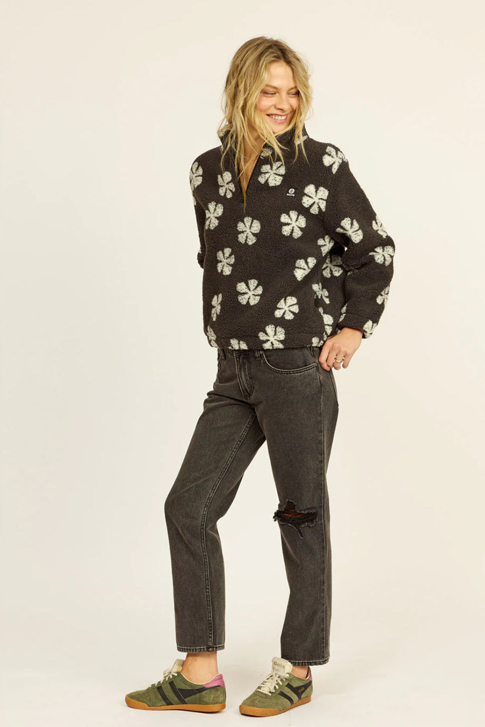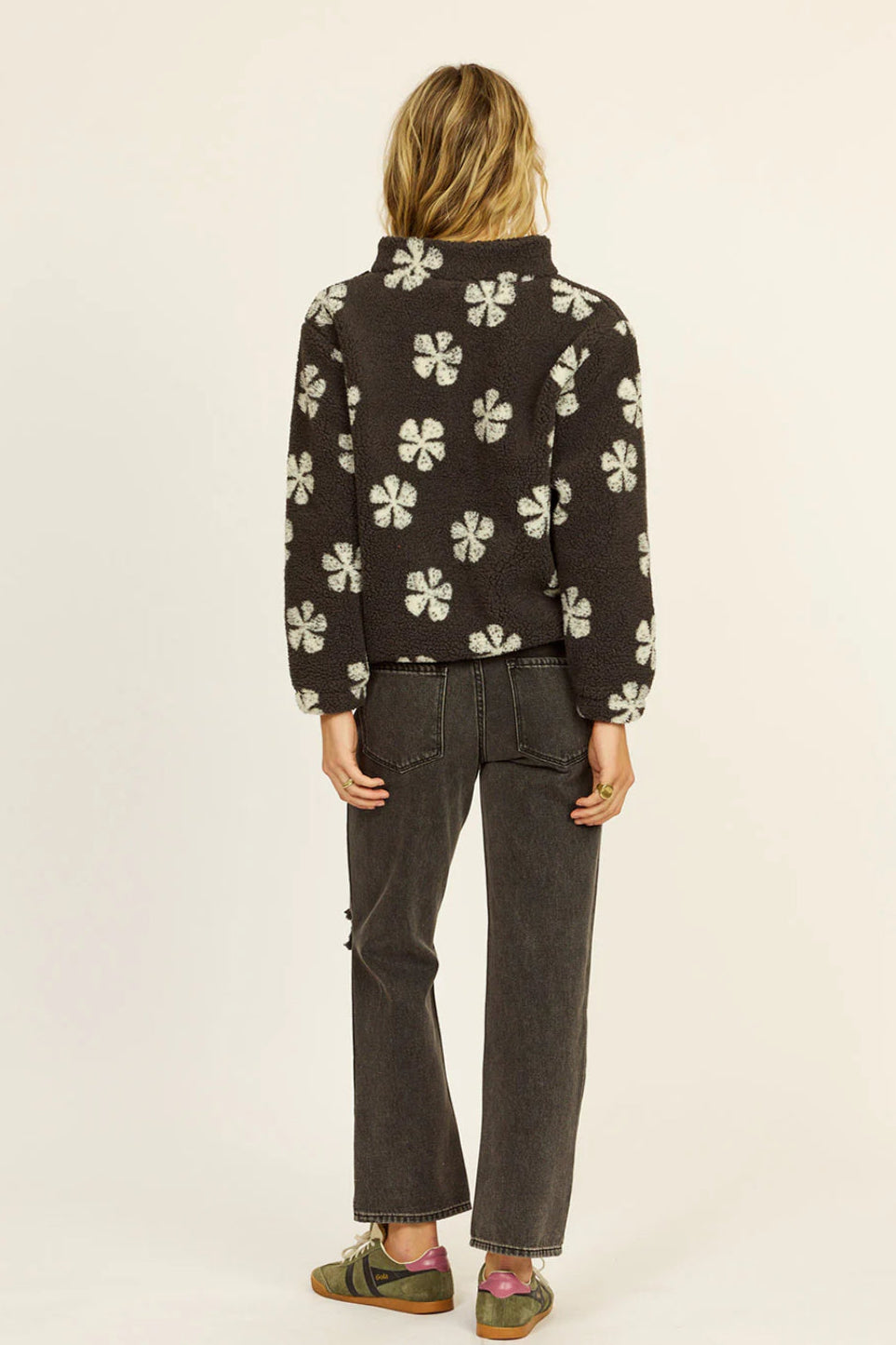 Cozy up in this sherpa fleece pullover featuring relaxed dropped shoulders, a playful floral pattern, and snug gathered cuffs and hem for extra comfort. Perfect for layering on chilly days.