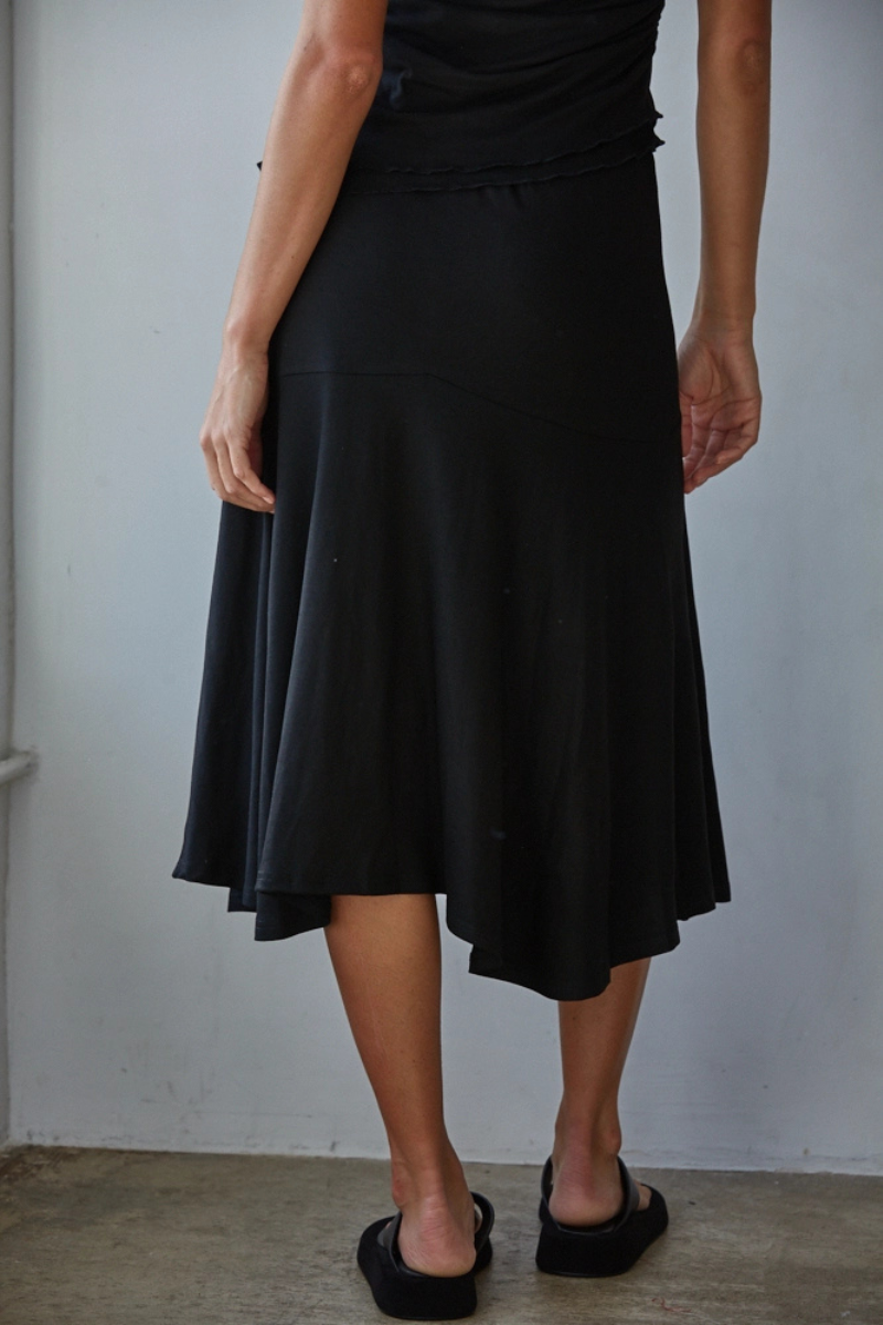 A beautifully fluid midi skirt designed with a smooth, flattering drape. Crafted from a soft viscose-spandex knit, it gently skims the body before falling into a subtle flared hem that moves gracefully with every step. The elastic waistband offers pull-on ease and all-day comfort, while the stretch fabric creates a sleek, comfortable fit.