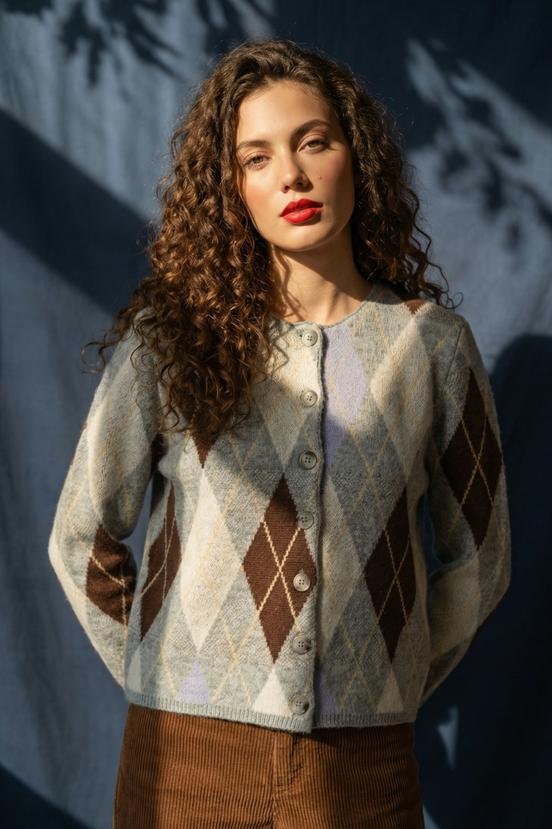 A fresh take on a timeless classic, this argyle button-up cardigan brings softness, charm, and easy everyday style. Designed in a relaxed silhouette, it features a multi-tone diamond pattern in cool, muted hues with contrast detailing. Finished with a full button front and cozy knit texture, it’s the perfect layer for denim, trousers, or dresses.