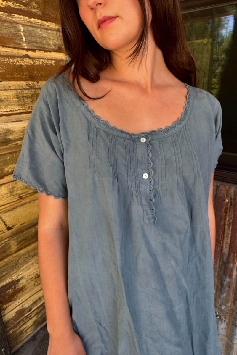A timeless piece of French domestic elegance, The House Dress embodies the beauty of simplicity. Crafted from soft, breathable cotton, this charming blue dress features intricate pintuck detailing down the bodice and delicate eyelet lace trim along the neckline and sleeves. The scooped neckline and short sleeves lend a graceful, feminine touch, while the front placket with original buttons adds authentic vintage character. Its relaxed silhouette is perfect for wearing at home, to the market, or layered under your favorite sweater for effortless vintage style.