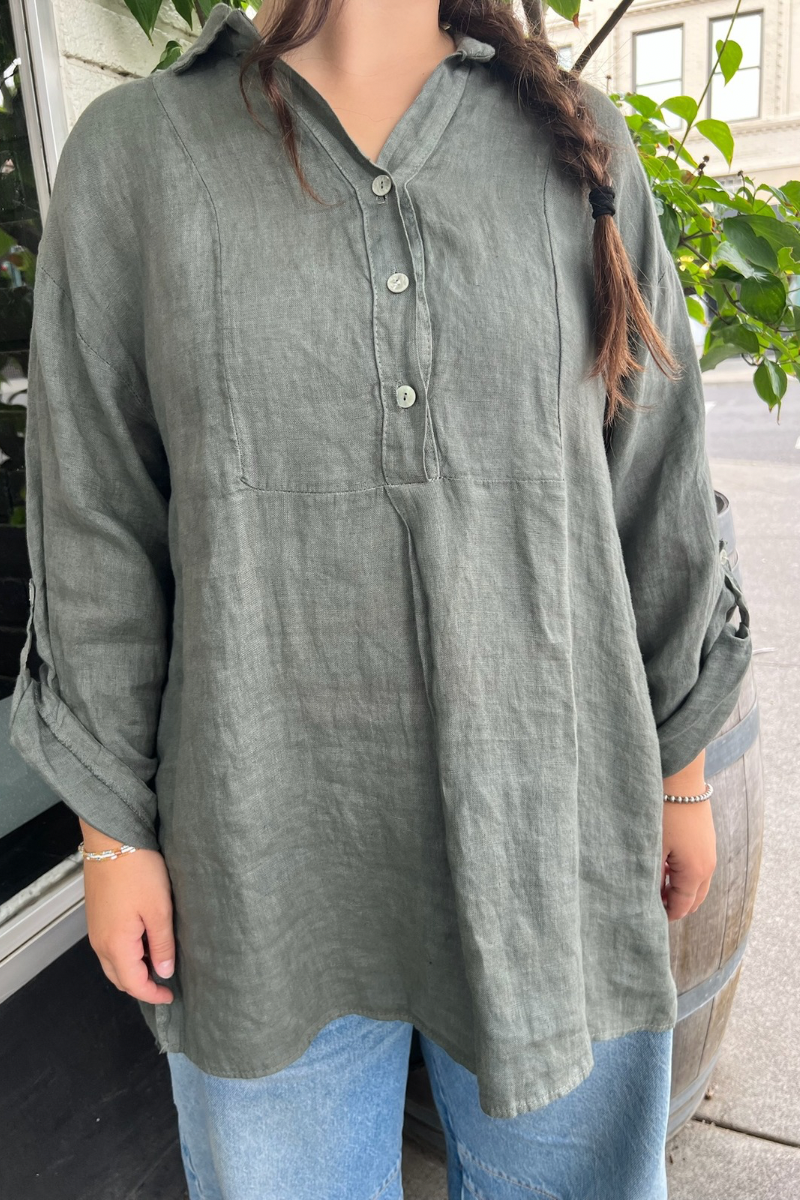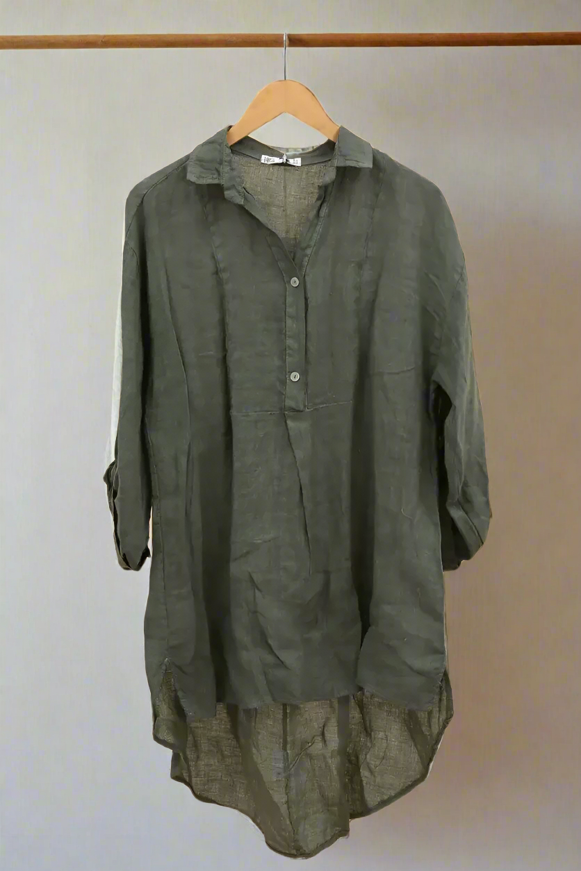 Breezy, effortless, and timeless......this linen tunic is a staple for every season. Its relaxed silhouette drapes beautifully, offering both comfort and understated elegance. Perfect for layering or wearing on its own, it transitions seamlessly from casual days to elevated evenings.
