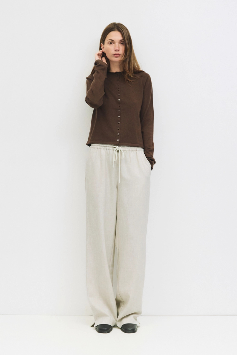 The Shea Cardigan is crafted from a midweight knit with a soft, comfortable feel. Designed with a rolled neckline and long sleeves, it features a simple front button closure for easy layering.