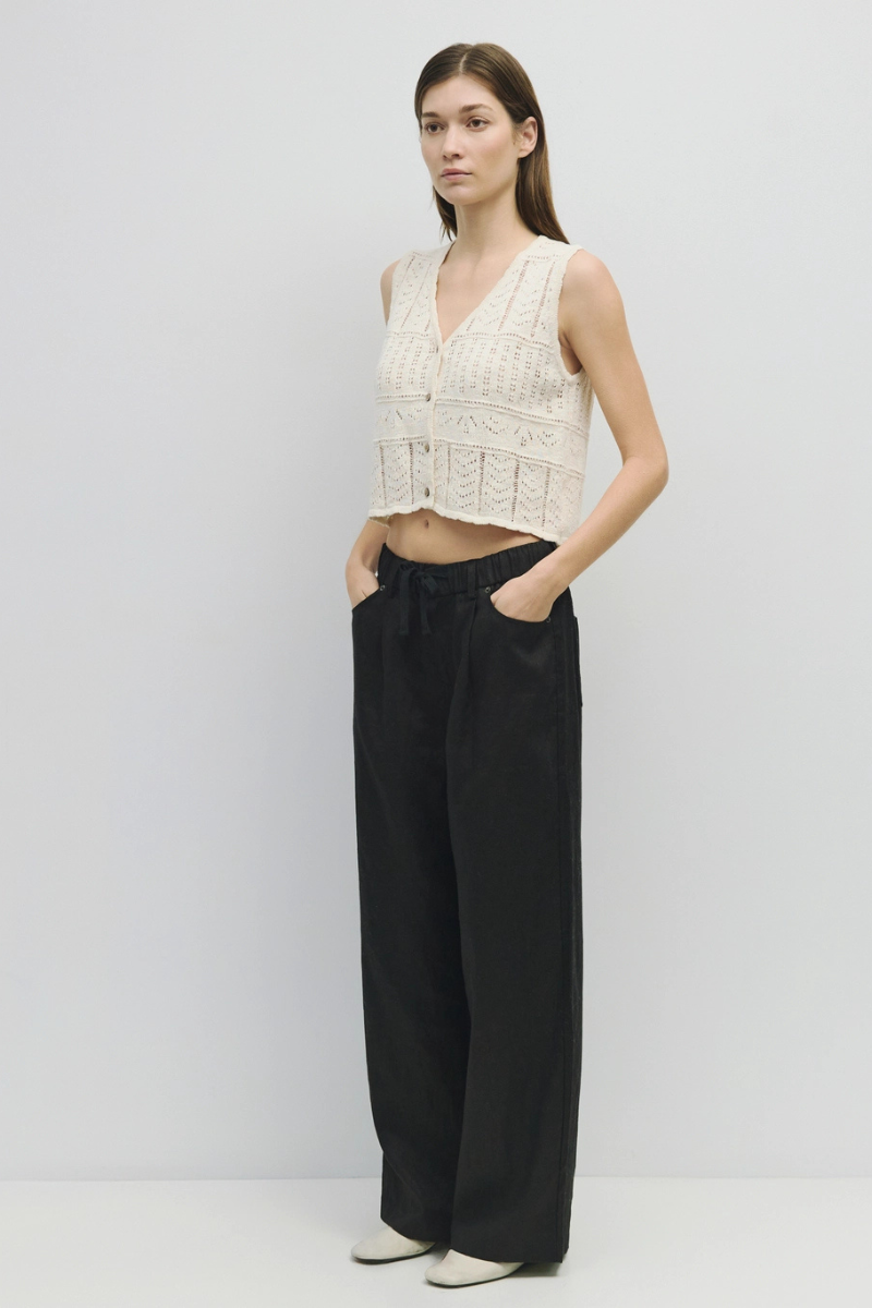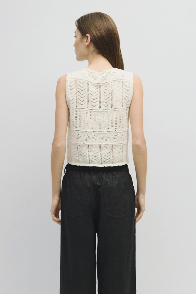 The Soleil Top is a soft, feminine knit designed for effortless layering and everyday wear. Crafted from breathable cotton, this sleeveless vest features a delicate pointelle pattern that adds subtle texture and charm.