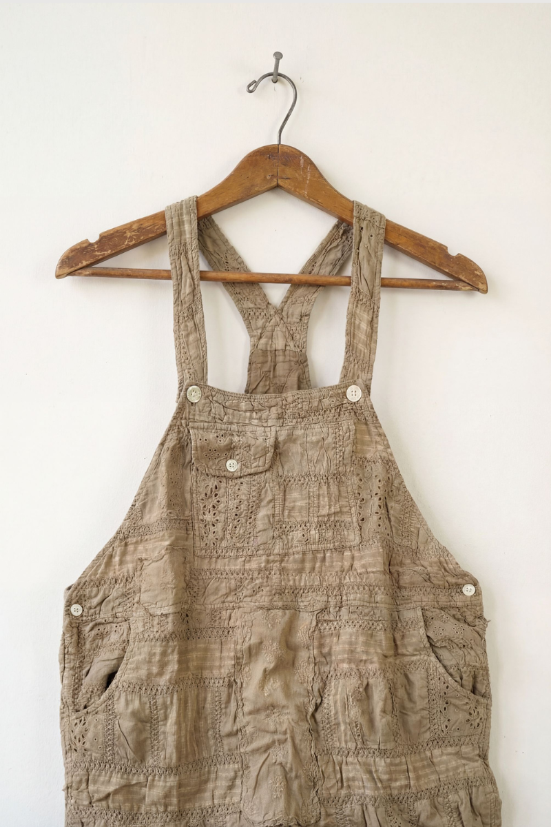 A truly special, artful take on classic overalls. These patchwork lace overalls are rich with texture, detail, and timeworn charm. Crafted in a soft, earthy neutral, they feature an allover mix of lace panels, eyelet detailing, and subtle stitched patterns that give each pair a one-of-a-kind, heirloom feel.