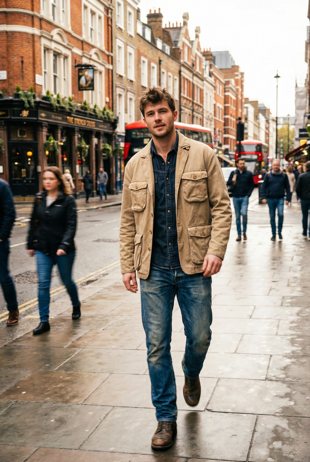 Features: Button front, four flap pockets, epaulettes, partial lining