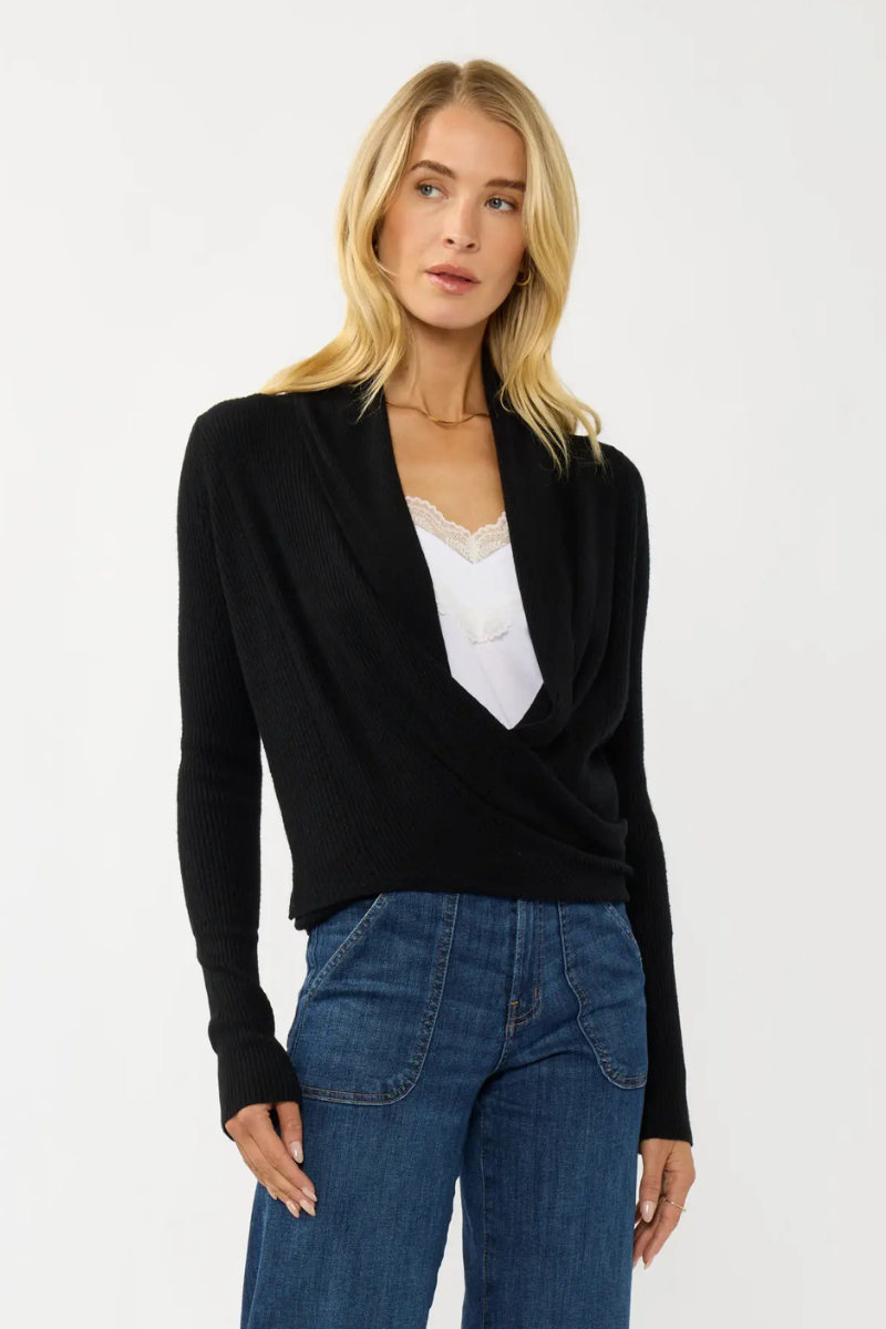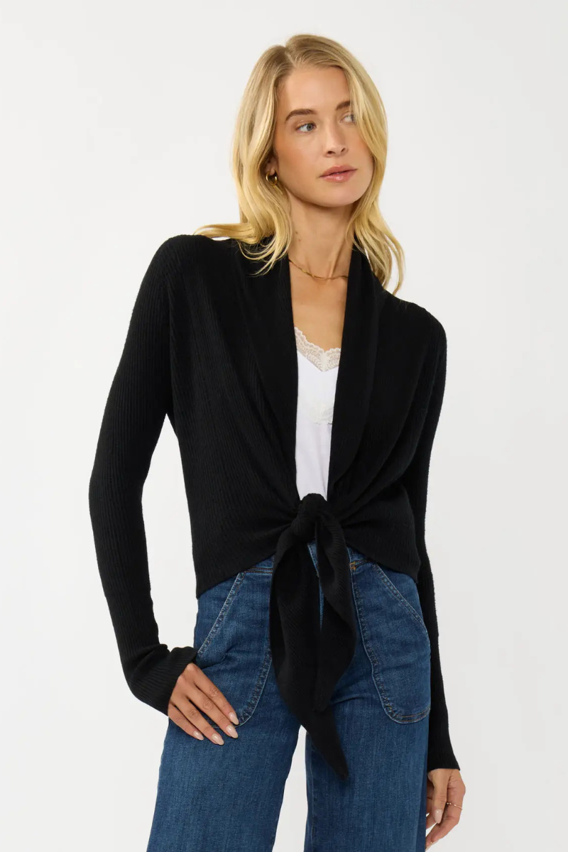 A versatile long sleeve cardigan designed to style multiple ways. Wear it open, tied at the front, or wrapped for a more structured look. Two exterior buttons allow for easy transitions between styles, making it a flexible layering piece for everyday wear.