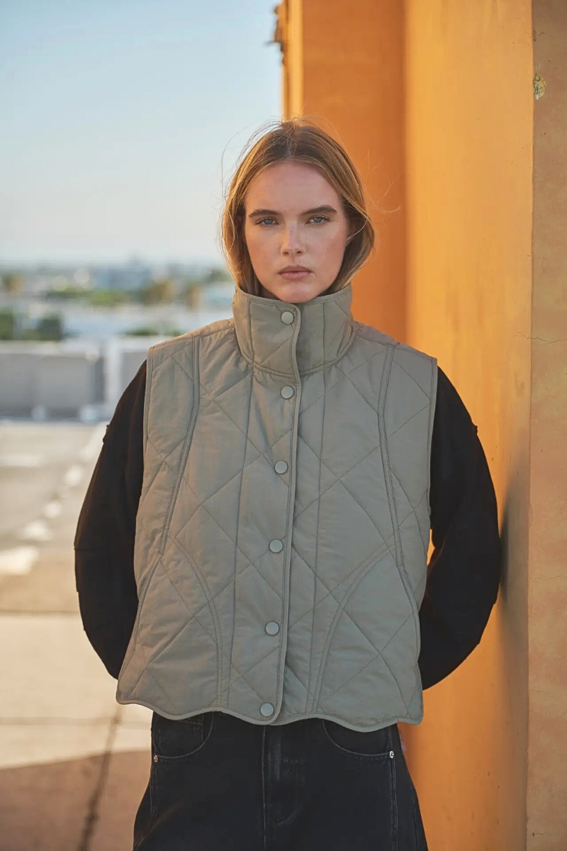 A versatile layer designed for easy transitions into fall, the Aaron & Amber Quilted Vest pairs lightweight warmth with everyday style. Featuring a relaxed, slightly oversized fit and long armholes, it’s perfect for layering over knits or tees. The down-filled quilted design provides cozy comfort, while thoughtful details...like a novelty printed interior, reflective locker loop, and wave hem that add signature character.