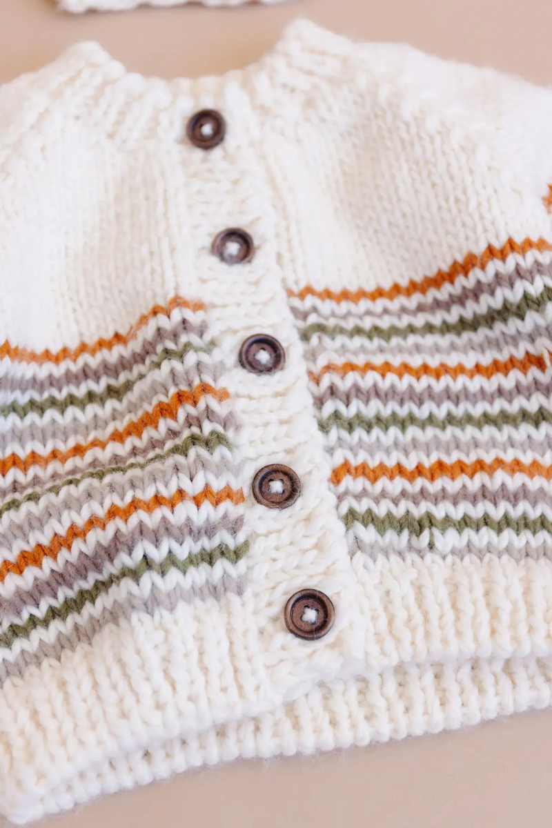 Wander through the woods with the little adventureres in our Woodland Stripe Cardigan. This Cream cardigan features stripes of our Clay, Flax, Moss, and Tan colors. Pair with our matching stripe hat or the Fox or Deer Hat.
