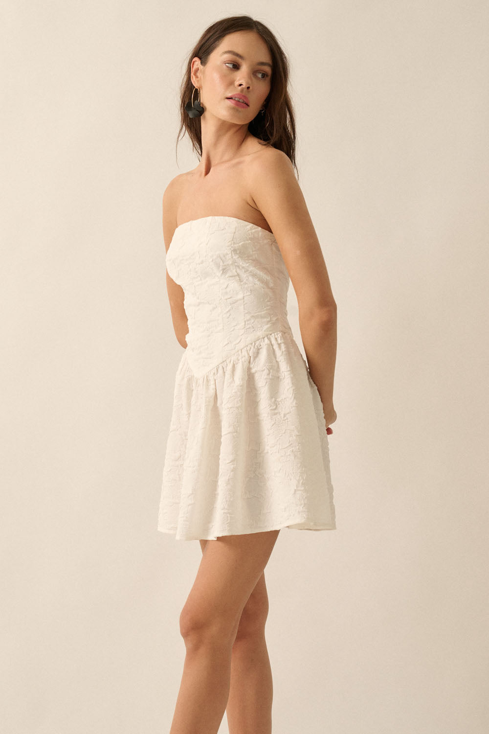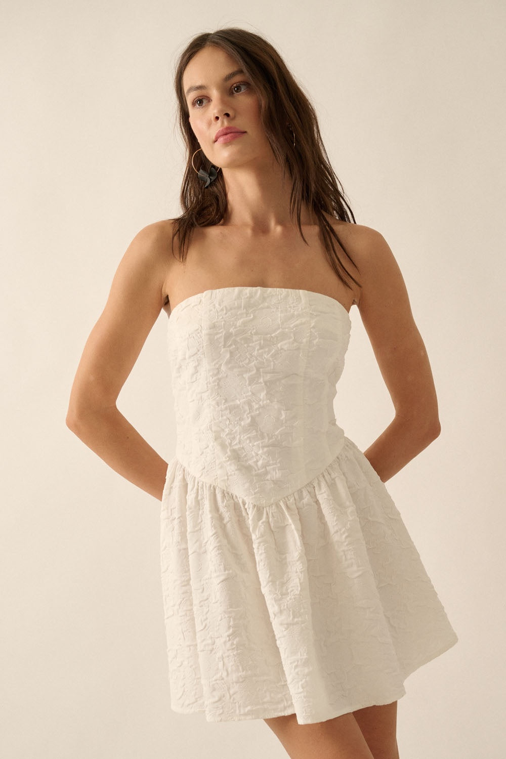 Indulge in the luxury of our woven corset mini dress, adorned with an abstract floral pattern. This exquisite piece boasts a strapless straight neckline, a sleeveless design, and a corset-style bodice. The low back with zipper closure adds a touch of sensuality, while the thigh length and fit and flare silhouette complete the look.