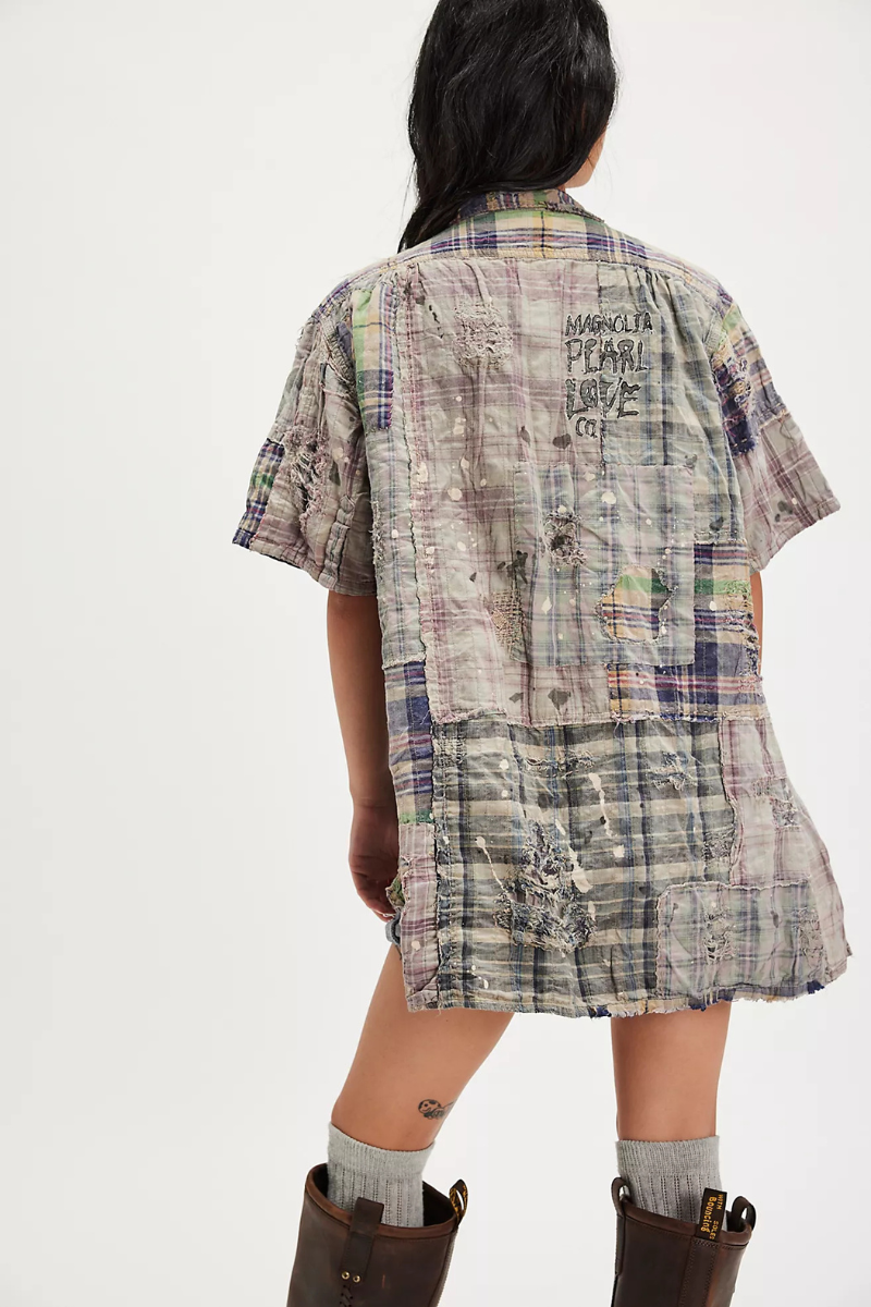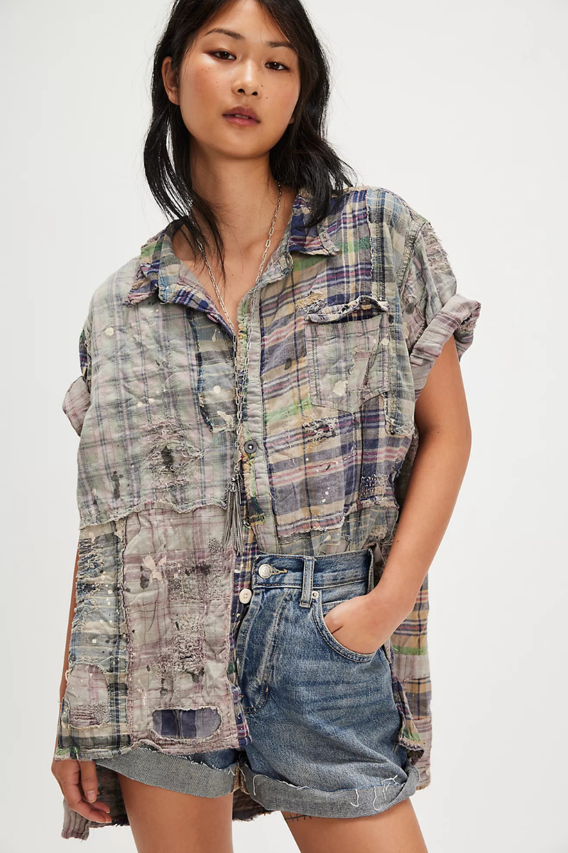 A one-of-a-kind take on the classic flannel, the YD Patchwork Perletta Shirt blends mismatched plaids, paint splatters, and Magnolia Pearl’s signature hand-distressing for an artful, lived-in look. Short sleeves and lightweight cotton make it an easy layering piece across seasons.
